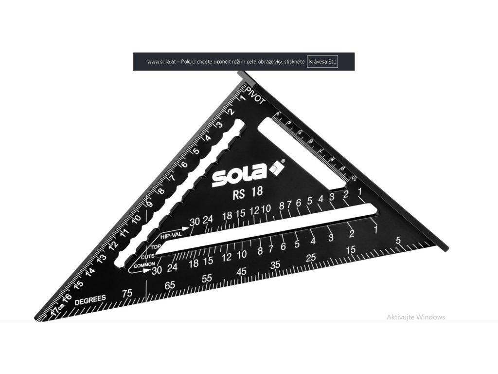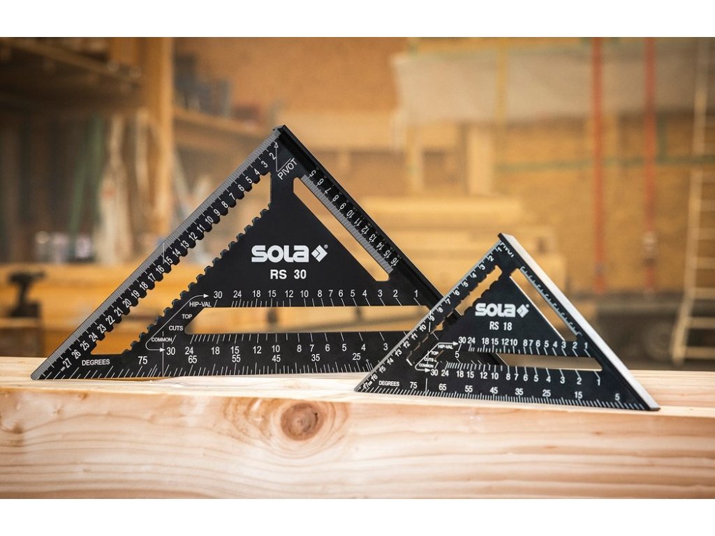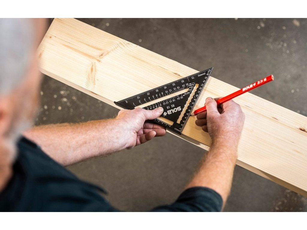 Příložný tesařský trojúhelník od společnosti SOLA spojuje funkce pravítka, příložného úhelníku, pokosového úhelníku, úhloměru, rozrýsovací pomůcky, vedení pro pilu a měřiče střešních krokví. Metrický tesařský úhelník ve tvaru pravoúhlého trojúhelníku má robustní doraz na jedné odvěsně pro přesné vyznačování úhlů 90 a 45°. Navíc slouží doraz i jako pomůcka, resp. vedení pro pilu. Rovnoběžně k dorazu je umístěn výřez s metrickou stupnicí v mm a cm (offsetová stupnice), která je ideální pro vyznačování kolmých linií. Měřicí rameno druhé odvěsny má také metrickou stupnici, která umožňuje rychlá měření. Pod touto stupnicí je výřez se zářezy, pomocí kterých lze zakreslovat horizontální resp. vertikální linie. Přepona je vybavena stupňovou stupnicí pro měření úhlů mezi 0 a 90°. Požadovaný stupeň úhlu se stanovuje na základě protilehlého otočného bodu (označení na tesařském úhelníku: PIVOT). Rovnoběžně se stupňovou stupnicí se nachází další výřez se dvěma stupnicemi pro řez námětků. Spodní stupnice je určena pro běžné krokve (označení na tesařském úhelníku: COMMON), zatímco horní je určena pro nárožní a úžlabní krokev (označení na tesařském úhelníku: HIP-VAL). V pravém úhlu ke stupňové stupnici je značkovací pomůcka 90° pro řez vaznic.