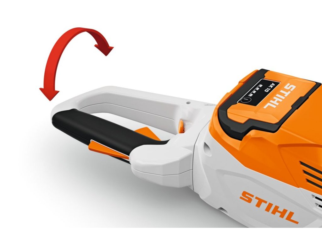 Multifunkční rukojeť aku nůžek můžete stisknutím tlačítka otočit o 90° doleva a doprava. Díky geometrii nože ve tvaru kapky s roztečí zubů 34 mm jsou větve drženy v noži a řezány čistě s velmi dobrým řezným výkonem. Pokud se v nožích zachytí nepoddajné větve, stačí stisknout hlavní spínač a spustit systém proti zasekávání, který změnou směru otáčení umožní opětovný volný chod nožů.