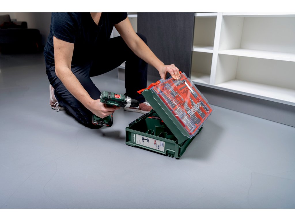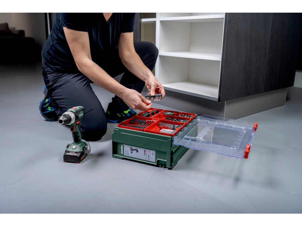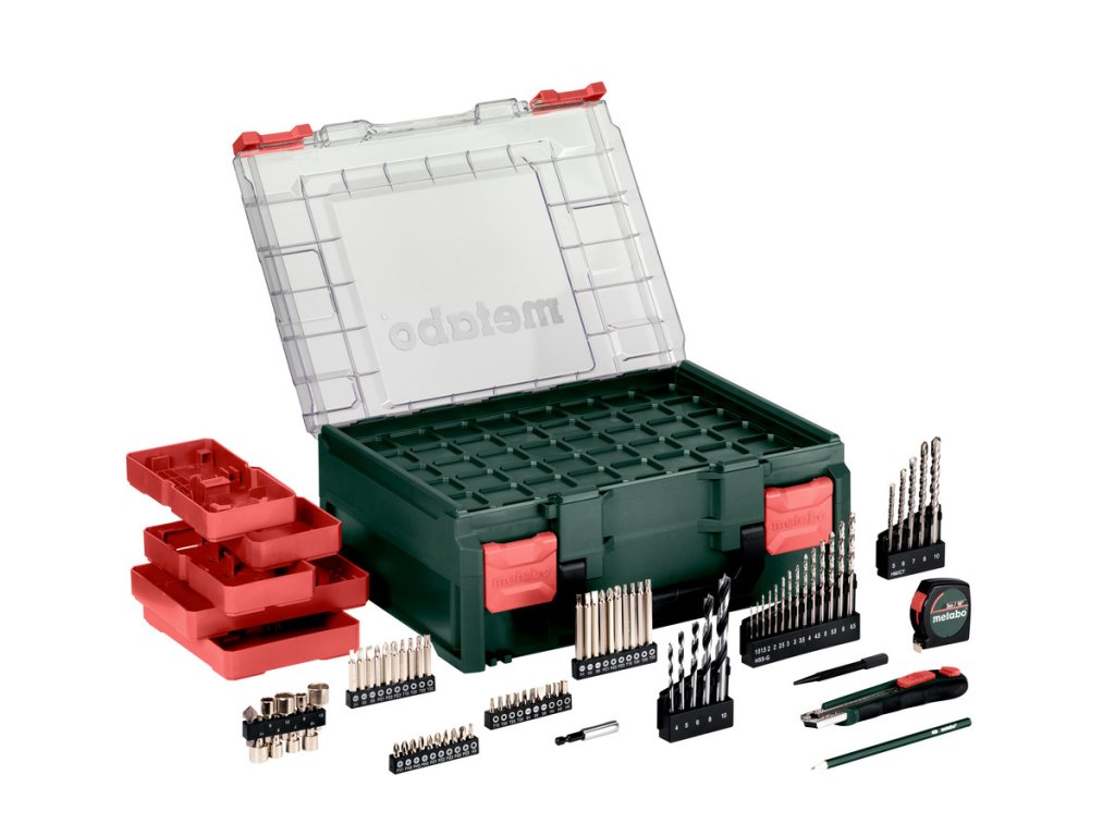 - Mobilní dílna (78dílná): 5 vrtáků na dřevo (4/5/6/8/10mm), 5 vrtáků do kamene (5/6/7/8/10mm), 14 vrtáků HSS (1,5/1,5/2/2/2,5/3/3/3,5/4/4,5/5/5,5/6/6,5 mm), 20 šroubovacích bitů délky 25 mm (PH1/PH2/PH2/PH3/PZ1/PZ2/PZ2/PZ2/PZ3/H3/H4/H5/H6/T15/T20/T25/T30/S4/S5/S6), 10 šroubovacích bitů délky 50 mm (S4/S5/S6/PZ1/PZ2/PZ3/T15/T20/T25/T30), 10 šroubovacích bitů délky 75 mm (S4/S5/S6/PZ1/PZ2/PZ3/T15/T20/T25/T30), držák bitů (60 mm), 8 nástrčných klíčů (6/7/8/9/10/11/12/13 mm), záhlubník do dřeva (12,7 mm), středicí kolík (5x100 mm), řezací nůž se 2 náhradními čepelemi, svinovací metr (3 m/10"), tužka (HB)