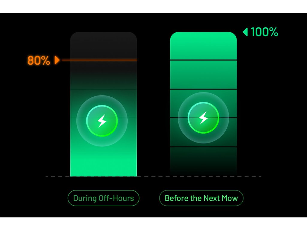 Jakmile baterie dosáhne kapacitu nižší jak 15 %, robotická sekačka YUKA mini 2 1000 se automaticky vrátí do nabíjecí základny a dobije baterii. Po nabití baterie pokračuje v sečení trávy od místa, kde bylo sečení přerušeno.