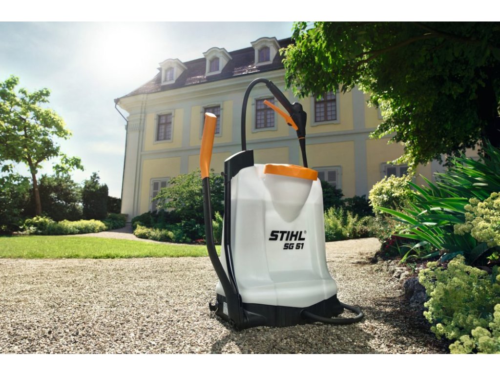 Zádový zahradní postřikovač STIHL SG 51 je vhodný pro příležitostné i profesionální použití. Postřikovač SG 51 podporuje efektivní péči o rostliny, zejména při práci na velkých obdělávaných plochách. Díky standardní mosazné duté kuželové trysce můžete s tlakovým postřikovačem aplikovat postřikovací prostředek velmi přesně a cíleně. Velký plnicí otvor a ergonomický uzavírací ventil s manometrem a teleskopickou trubkou usnadňují manipulaci stejně jako centrální vývod hadice a systém pro pohodlné přenášení. Postřikovač STIHL SG 51 se celkově používá velmi komfortně a flexibilně: Díky páčce čerpadla, kterou lze namontovat na pravou i levou stranu, můžete postřikovač ovládat jako pravák i jako levák. Páčka čerpadla je také nastavitelná na šířku a délku, takže ji lze individuálně přizpůsobit konkrétnímu uživateli. Dva zádové popruhy nosného systému lze na přístroj STIHL SG 51 upevnit ve dvou polohách a také individuálně nastavit jejich délku. Pokud chcete postřikovač přemístit nebo uskladnit, můžete postřikovací zařízení snadno uložit do integrovaného držáku postřikovací trubice.